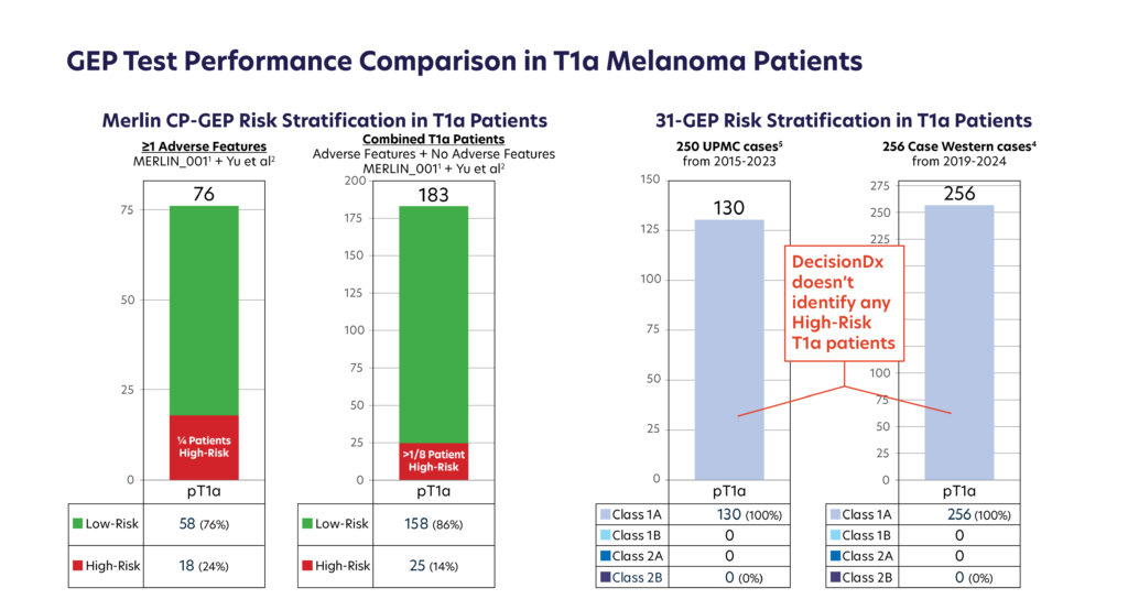 The purpose of molecular testing in thin melanoma is to identify tumors at higher risk than predicted by AJCC criteria — patients who might proceed to SLNB or receive more intensive monitoring. In these two independent analyses ⁴ ⁵, the 31-GEP assay did not classify any patients as high-risk, so these findings raise important questions regarding clinical utility. Merlin CP-GEP identified 18% of T1a patients as being high-risk in this recent publication². Notably, the current CMS/Medicare reimbursement rate for 31-GEP exceeds $7,000 per test, further underscoring the importance of demonstrating clear clinical value.