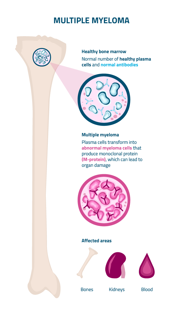 Multiple Myeloma (MM) is the second most common blood cancer. It starts in plasma cells, which are white blood cells found mainly in your bone marrow. The disease can behave differently in each patient, ranging from slow-growing forms to more aggressive types.